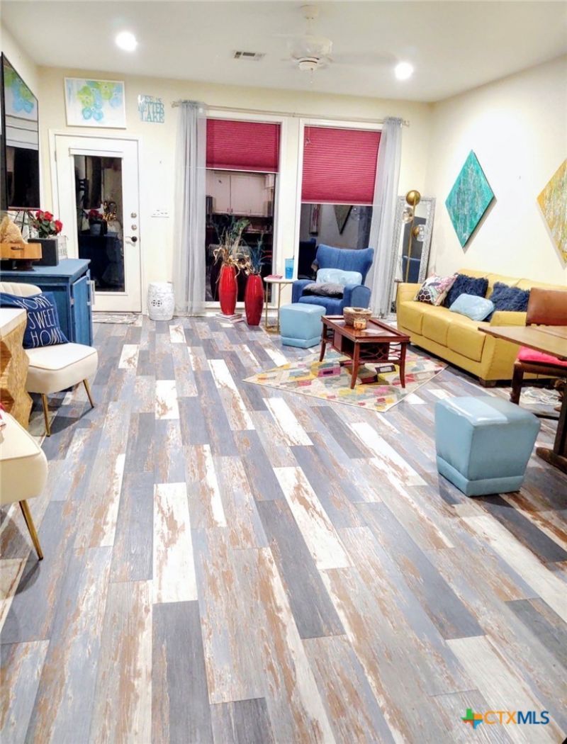 Resort-style living at Belton Lake! This beautifully upgraded water-view condo offers clear lake views from the back that feel like sitting in the treetops, while the front overlooks the luxury pool and patio entertainment area. Quiet second-floor end unit with elevator access, positioned away from stairs and heavy foot traffic for added privacy. Inside, the home features designer finishes and custom upgrades including custom kitchen cabinetry, Labrador granite countertops, stainless appliances, and a Samsung refrigerator with drawer. A designer mosaic tile backsplash and bar accent wall add distinctive style to the kitchen and entertaining space. The living areas and bedrooms feature custom distressed vinyl plank flooring, while the entry, kitchen, and bathrooms showcase elegant porcelain tile flooring and custom blackout cellular blinds on rear windows. The spacious primary suite includes double sinks, solid surface countertops, and a walk-in shower with custom glass enclosure, rain showerhead, and handheld showerhead. The guest bath includes a custom glass tub enclosure and solid surface countertops. The condos elevated position allows for clear lake views above the surrounding trees while still enjoying the beauty of the natural landscape and wildlife that frequent the nearby deer feeder morning and evening. This condo is being sold furnished, (including well kept washer and dryer) and may also be used as a long-term rental, offering flexibility for owners or investors. Conveniently located near Temple and Belton with easy access toward Austin.