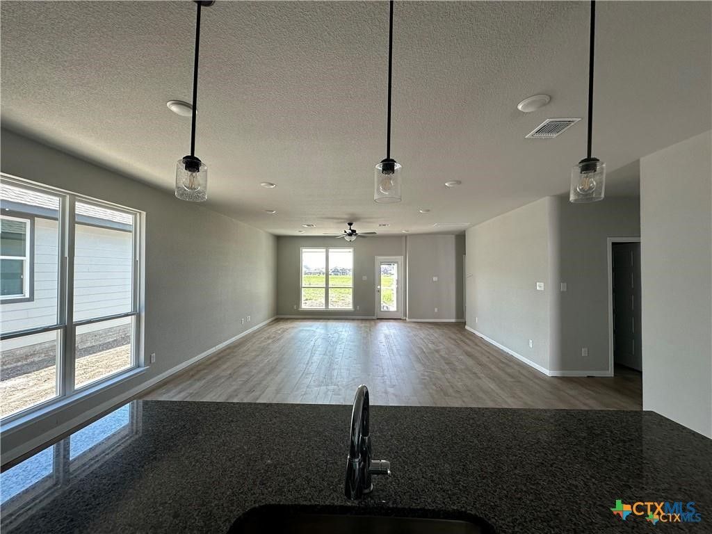 Step into this beautifully designed home and youre welcomed by a spacious foyer with soaring ceilings that create an immediate sense of openness. The home opens up into a bright, open concept living area where the kitchen, dining, and living room flow seamlessly together, perfect for everyday living or entertaining. This thoughtfully designed three bedroom, two-bath home features large windows in the living room, dining area, and primary bedroom, allowing natural light to fill the space and highlight its inviting atmosphere. The kitchen and bathrooms feature elegant granite countertops, while the primary suite offers a generously sized walk-in closet. Additional upgrades include a decorative tile backsplash, upgraded front door, built-in mini blinds in the rear door, extra LED recessed lighting, and a flexible study space with twin doors, ideal for a home office or quiet workspace.