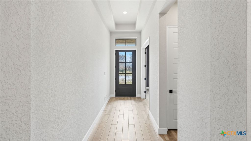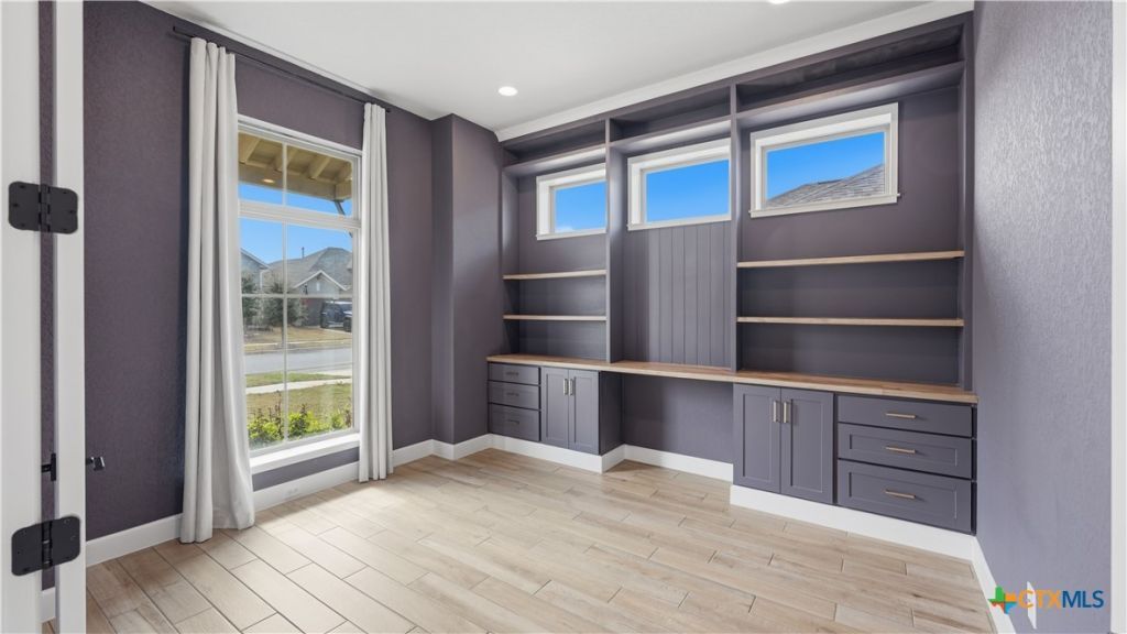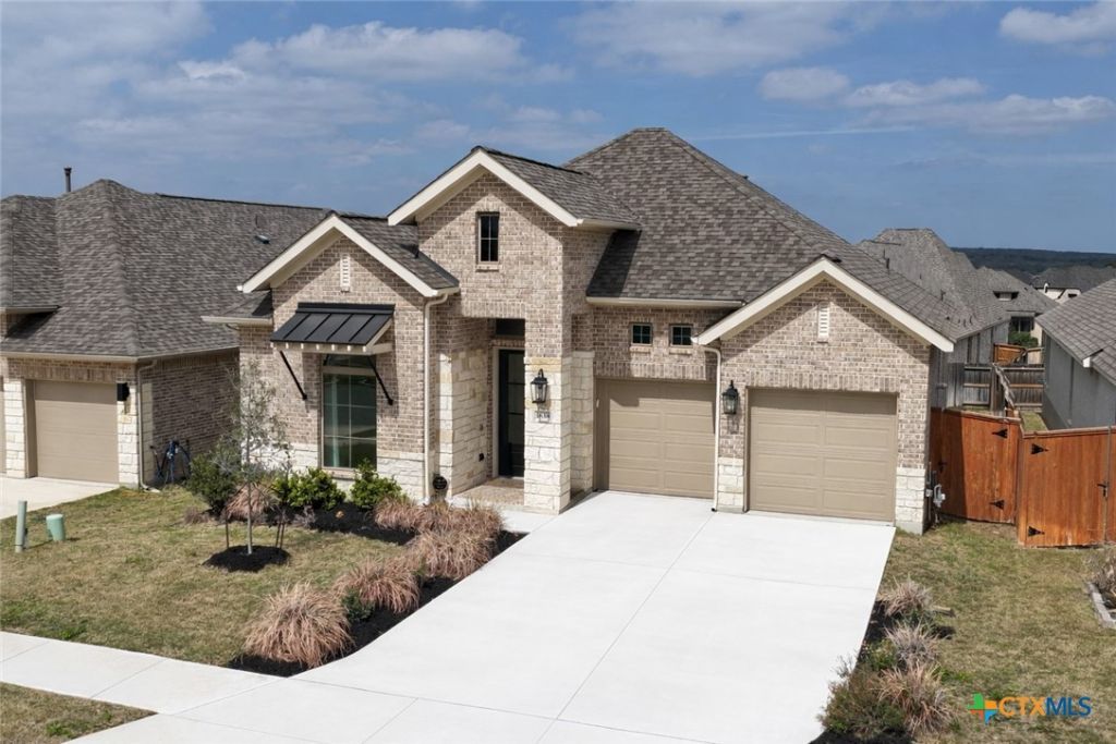 Luxury upgraded 3-bedroom, 2-bath home in the highly desirable Veramendi master-planned community in New Braunfels. Located on the hill, this thoughtfully designed home offers a semi-custom model home feel with premium finishes, smart home technology, and a modern open-concept layout. Interior features include 10 ceilings, 8 interior doors, quartz countertops throughout, and upgraded black hardware for a clean contemporary design. The spacious living room showcases a custom-built entertainment wall with storage, electric fireplace with heater, and built-in 75 Samsung TV with Bluetooth soundbar and subwoofer.The chef-style kitchen is designed for entertaining and everyday living with quartz countertops, built-in GE wall oven and microwave, WiFi-enabled vent hood, GE dishwasher, and a 5-burner gas cooktop. Additional upgrades include a hidden trash drawer, pantry shelving with jamb switch lighting, and a modern galley faucet. The primary suite retreat features a custom accent wall, custom-built closet, and spa-inspired bathroom with a frameless double shower and dedicated vanity space. Secondary bedrooms offer walk-in closets and ceiling fan pre-wiring, with fans installed in the primary bedroom and living room. Smart and energy-efficient upgrades include Ring doorbell, keyless entry, Ecobee smart thermostat, Leviton smart light switches, CAT6 wiring throughout, fresh air circulation system, and tankless water heater. The finished garage features epoxy flooring, storage organizers, built-in work desk with shelving, rough plumbing for a water softener, and garage door openers with exterior keypad. Enjoy outdoor living on the extended covered patio with a 72 smart fan, gas grill connection, electrical outlets, and paver walkway. Residents of Veramendi enjoy a lagoon-style pool, parks, trails, playgrounds, and convenient access to dining, shopping, and everything New Braunfels has to offer.
