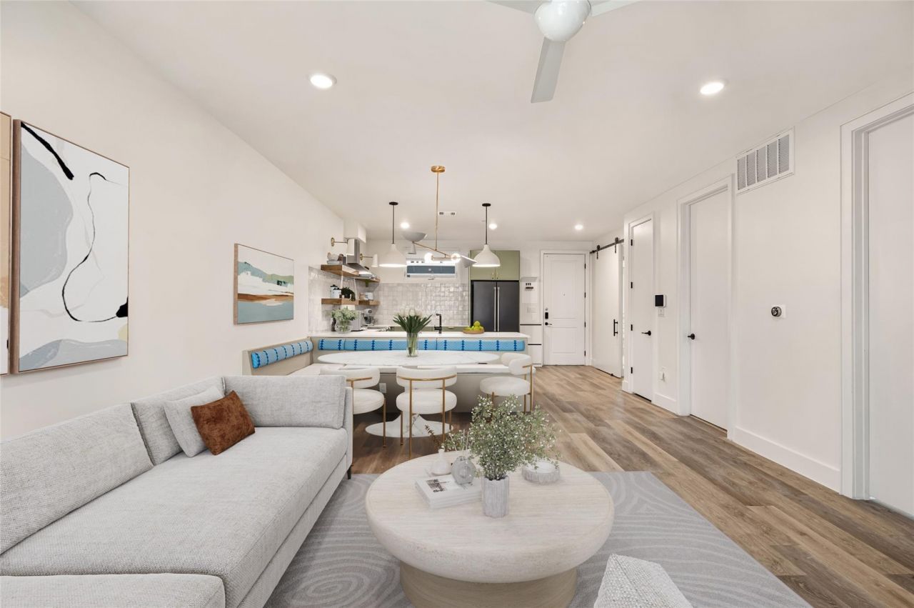 A modern East Austin home with treetop views, walkable restaurants, and downtown just minutes away.This one-bedroom plus flex residence at Santa Rosa offers the rare combination of city energy and peaceful surroundings. Set off the street on the quieter side of the building, the home looks out over tranquil greenery from both the bedroom and private balcony, creating a calm retreat while still being surrounded by some of Austins best restaurants, coffee shops, and nightlife.Inside, the open layout feels bright and welcoming with wide plank wood flooring and large windows that bring in natural light. A custom wall-mounted walnut console, handcrafted by Austin artisan Steve Pickens, adds warmth and character to the spacious living room.The kitchen blends modern design with thoughtful functionality. Quartz countertops, handcrafted zellige-style tile, sage cabinetry, floating shelves, and stainless steel Samsung appliances are anchored by a Caf matte black French door refrigerator. Rejuvenation pendant lighting adds a warm, design-forward touch, while an under-counter Waterdrop filtration system provides everyday convenience.The flex space includes a custom Murphy bed, making it easy to use as a guest room, home office, or creative workspace.The bedroom enjoys peaceful treetop views, while the spa-inspired bathroom features a frameless glass shower and geometric tile. Additional details include Levolor cellular shades and a Miele washer with heat-pump dryer.Enjoy morning coffee on the private balcony or relax on the buildings landscaped rooftop terrace. Walk to Suerte, Canje, Launderette, Fleet Coffee, Festival Beach, and the Lady Bird Lake Trail, with the 7th Street H-E-B just a short walk away.Here, you can enjoy the energy of East Austin while still coming home to a peaceful retreat.