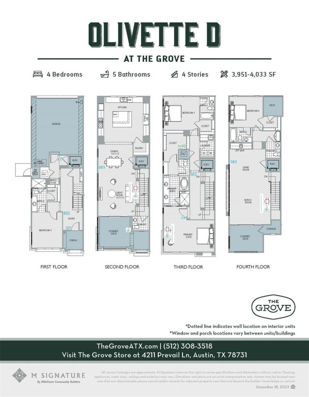 Welcome to The Grove, a thoughtfully curated mixed use community offering a refined, low maintenance lifestyle in one of Austins most central locations. Built along Shoal Creek, this pedestrian oriented neighborhood is surrounded by trails, parks, and green space while placing shopping, fitness, wellness services, and highly regarded dining just moments from home. Designed for ease of living, The Grove is ideal for those seeking a true lock and leave experience without giving up access, walkability, or style. This elegant four story Olivette D townhome by M Signature Homes spans 3,839 square feet and features four bedrooms, four full baths, and two half baths, all connected by a private elevator serving every level. A first floor guest suite offers flexible use for visitors, work from home needs, or multigenerational living. The main living level is open and inviting, highlighted by a chefs kitchen with 10 foot cabinetry, a large quartz island, and refined finishes that complement both everyday living and entertaining. The owners suite serves as a calming retreat with a spa inspired wet room complete with a freestanding soaking tub and oversized shower. Additional features include multiple living areas, durable RevWood flooring, two covered balconies, professional landscaping, a distinctive European inspired exterior, and a two car garage. The fourth floor provides an additional bedroom with a private bath, ideal for guests or a private office. Situated at the corner of 45th Street and Bull Creek Road, residents enjoy quick access to downtown Austin and major employment centers, with a pedestrian bridge leading directly to Central Market and Shoal Creek trails just outside the community. With unmatched convenience, low upkeep design, and proximity to dining, shopping, and outdoor recreation, this residence offers effortless lock and leave living in one of Austins most desirable central neighborhoods.