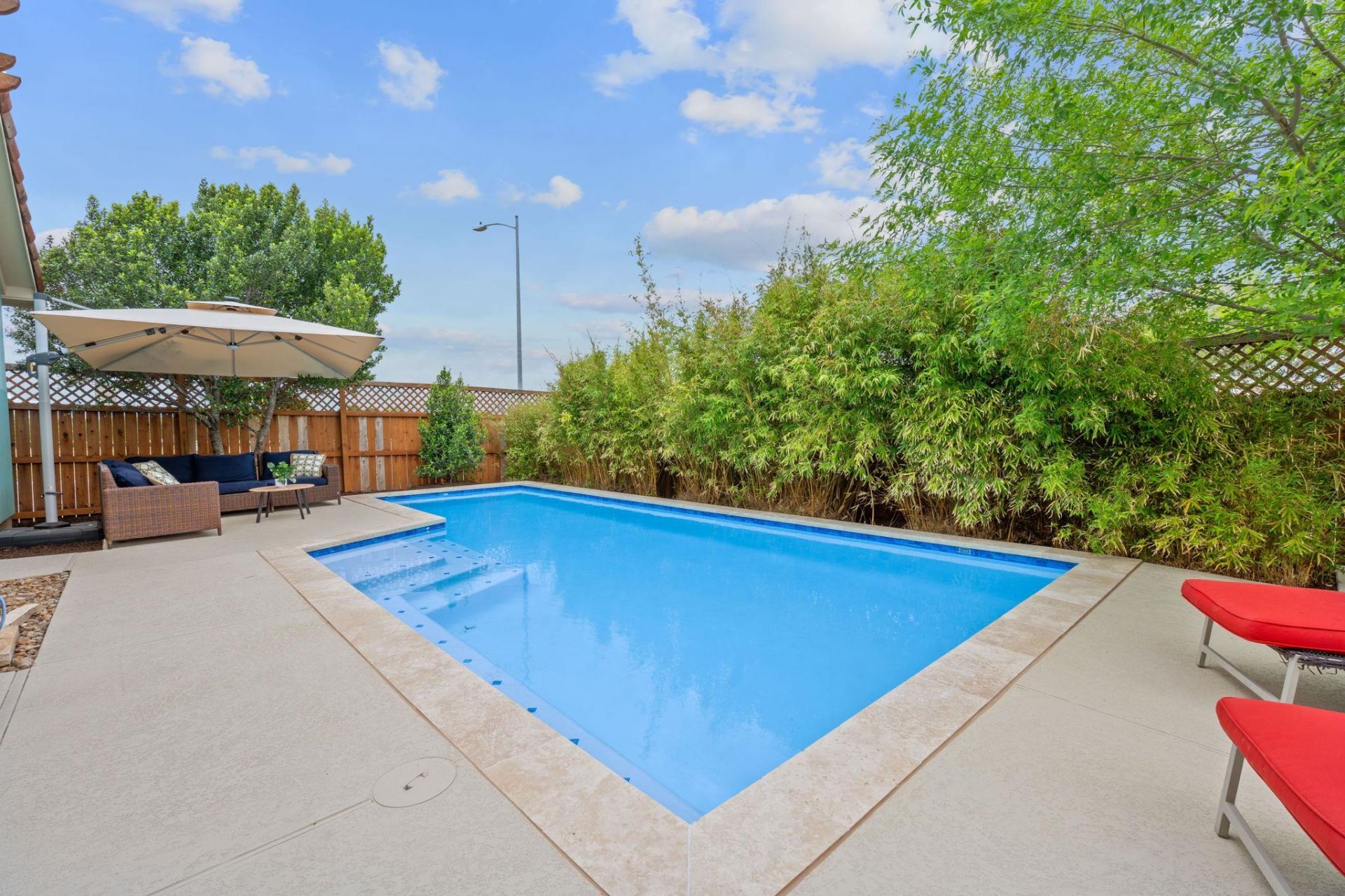 Chic, modern living in East Austins sought-after Agave community, just a short stroll to the neighborhood park. Set on a corner lot, this home offers a private backyard retreat with a heated and cooled pool for year-round use - resurfaced December 2025 with a heat pump replaced in 2021. This vibrant East Austin community has its own Slack channel, buy/sell/trade pages, and several annual activities. Enjoy peaceful strolls with wide sunset skies and glimpses of the city skyline.Built in 2006 and carefully maintained by its original owners, the home blends clean updates with an easy, open layout. Inside, high ceilings and abundant natural light highlight fresh neutral paint, updated lighting, modern ceiling fans, and durable luxury vinyl plank flooring. The living area flows into a dining space framed by beautiful bay windows. The kitchen is finished with quartz countertops, updated stainless appliances, and a butcher block island.The main-floor primary suite is tucked away with direct access to the patio and pool, along with a walk-in closet and ensuite bath with a stylish updated walk-in shower. Upstairs, two bedrooms with new carpet share a full bath and capture views toward Downtown Austin. A main-floor powder room and laundry add everyday convenience.Outside, the freshly painted stucco exterior is paired with a tile roof, established landscaping, and updated privacy fencing. A curved drive leads to an attached carport with a Tesla charger.Located with quick access to MLK and close to Springdale Station, Canopy, Walnut Creek Trail, and the Austin Tennis & Pickleball Center, plus dining along Manor, Airport, 12th, and MLK. Approximately 7 miles to Downtown and UT, 8 miles to the airport and Tesla, and about 20 minutes via 183 to The Domain and Austins tech corridor. This is the one youve been waiting for ? Schedule your tour today!